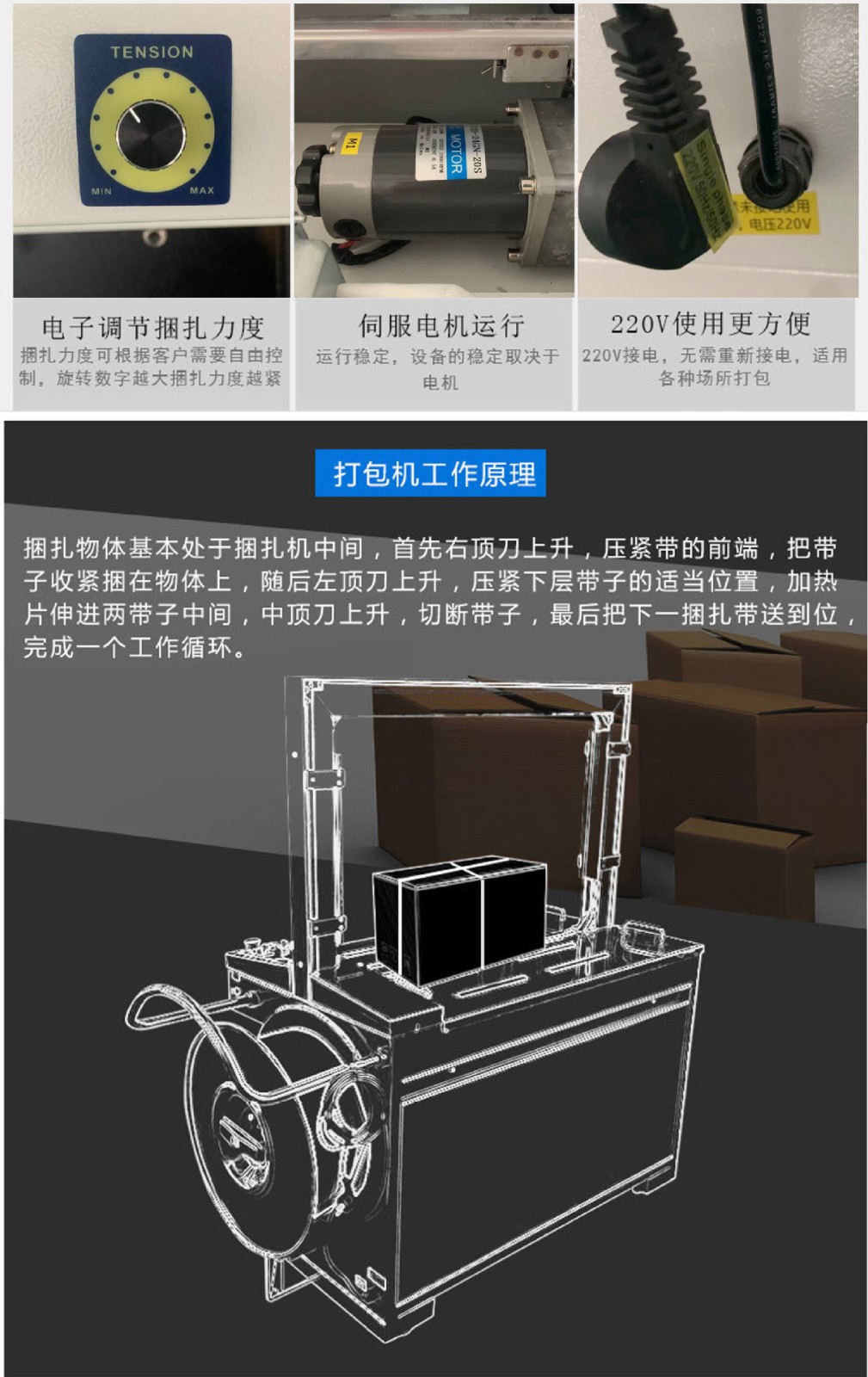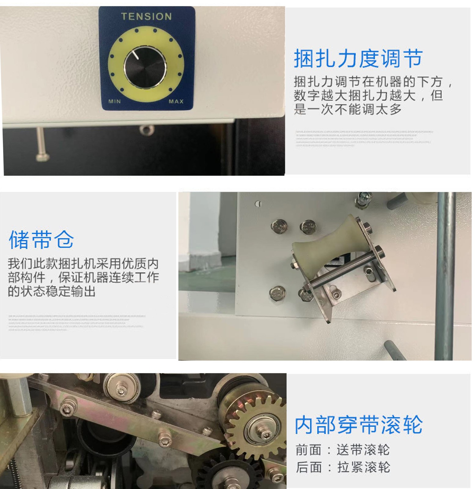它主要由進帶機構、捆扎機構、加熱裝置、控制系統等組成。