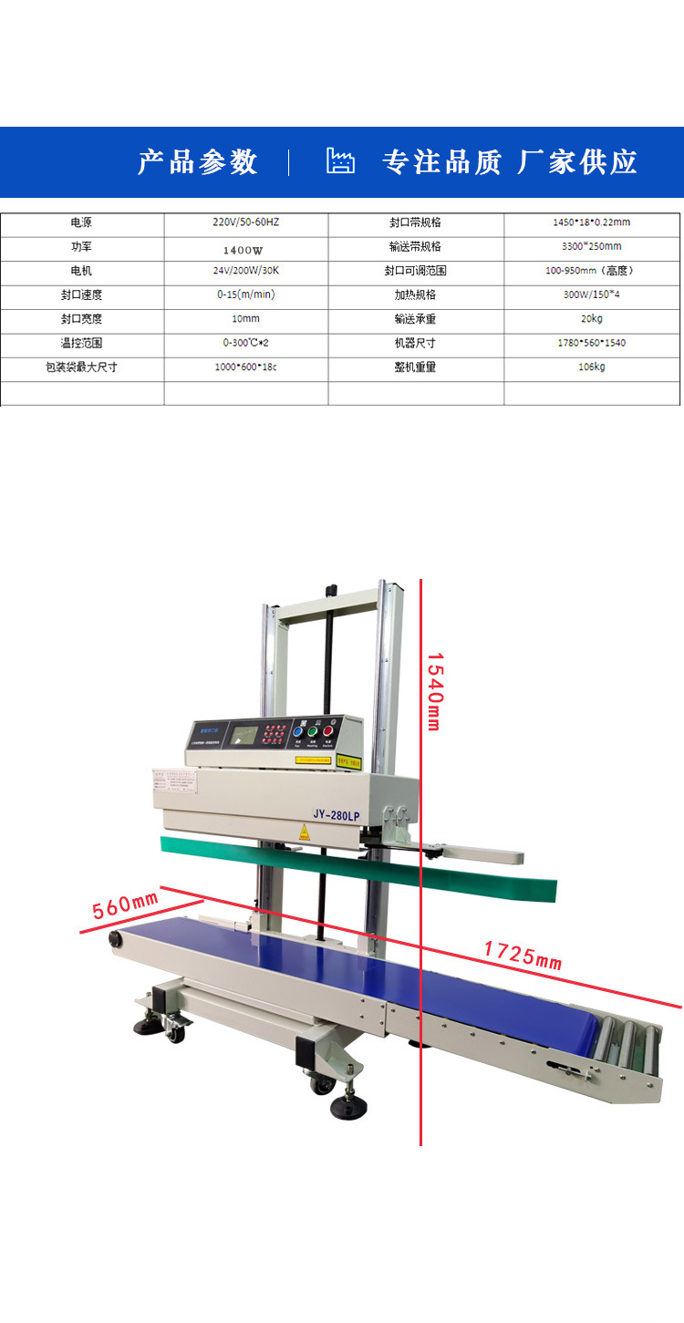 BG-280L大型立式連續(xù)式封口機載重大,可升降高度調節(jié),適用于大包裝大重量的裝袋封口包裝