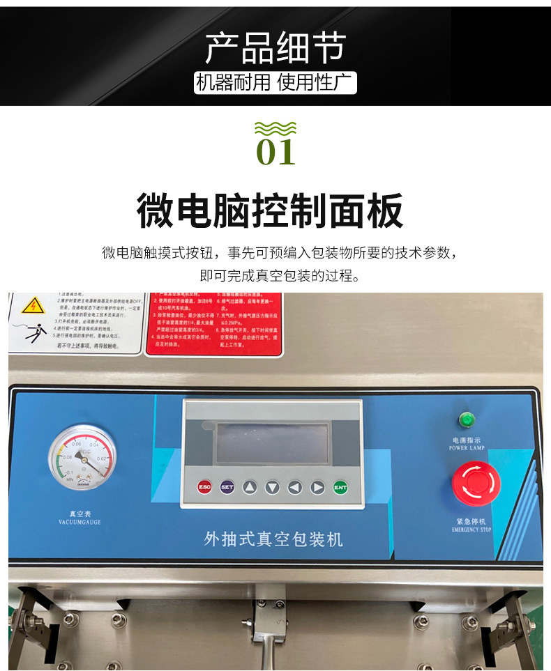 多功能性:除了基本的抽真空和封口功能外,許多氣動外抽真空包裝機還具備充氣功能,可向包裝袋內充入氮氣、二氧化碳等惰性氣體,進一步防止物品氧化、變質,同時還能起到防擠壓、保鮮保味等作用,滿足了不同產品的多樣化包裝需求.