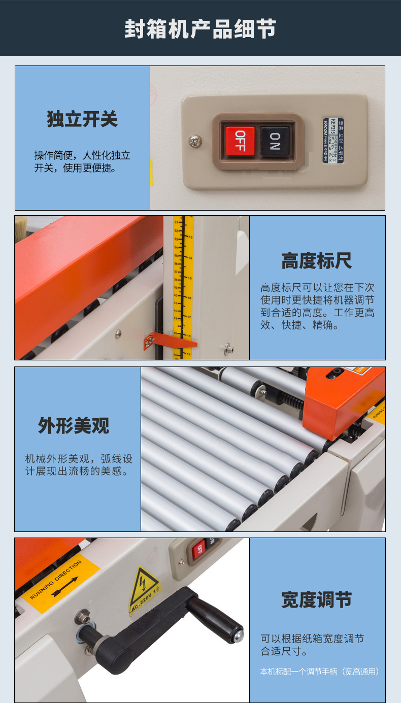- 有膠帶支架、膠帶切割裝置和膠帶粘貼裝置等部分。膠帶支架用于放置膠帶卷,膠帶切割裝置能夠準確地將膠帶切斷,避免膠帶過長或過短影響封箱效果。膠帶粘貼裝置則通過壓力滾輪等結構將膠帶粘貼在紙箱上,并且可以調整粘貼的壓力,適應不同厚度的紙箱。