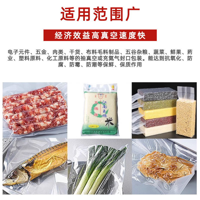 - 適用范圍廣:不受產(chǎn)品外型、尺寸的限制,特別適合大件或形狀怪異的物體進(jìn)行真空包裝,可用于包裝液體、固體、粉狀糊狀的食品、糧食、果品、醬菜、果脯、化學(xué)藥品、藥材、電子元件、精密儀器、稀有金屬等 123。