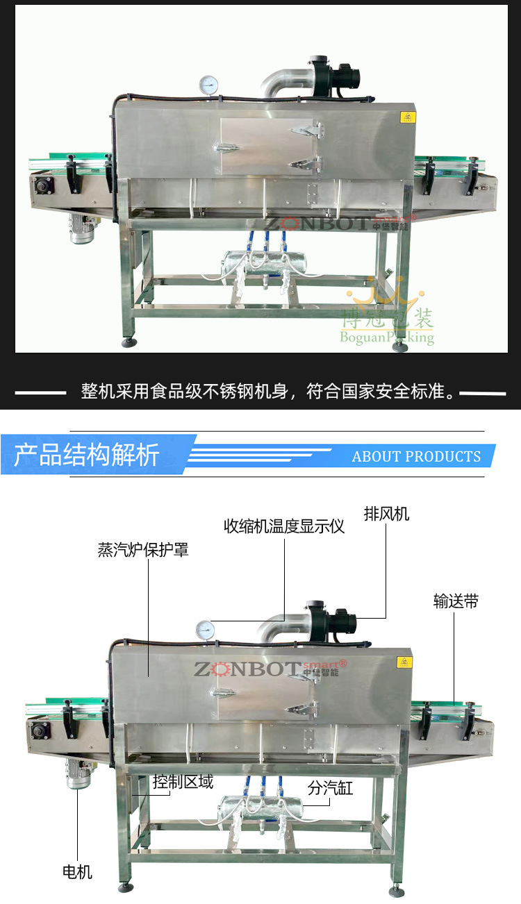 - 蒸汽收縮機:通常有主副 2 個加熱器,可調節功率,輸送帶無級調速。有三層隔熱和防水設計,多采用不銹鋼 304 制造。兩側噴管可多角度調整,前后有進出口護罩,下部有接水盤4。