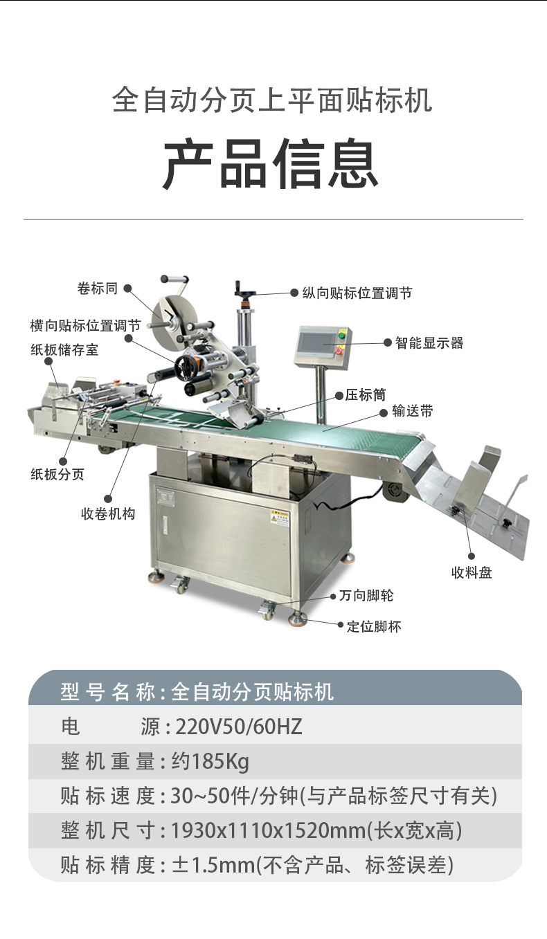 全自動分頁貼標(biāo)機(jī)作為現(xiàn)代生產(chǎn)線上的高效利器,具備極為出色的連續(xù)作業(yè)能力。其內(nèi)部構(gòu)造精密且協(xié)同性強(qiáng),分頁裝置運(yùn)用獨(dú)特的機(jī)械原理,如高速旋轉(zhuǎn)的分頁滾輪,通過精準(zhǔn)調(diào)控的摩擦力,能夠?qū)⒍询B在一起的標(biāo)簽或待貼標(biāo)產(chǎn)品迅速且穩(wěn)定地逐張分離。在分離過程中,速度把控極為精準(zhǔn),可根據(jù)預(yù)設(shè)參數(shù),以每分鐘高達(dá)數(shù)百甚至上千次的頻率持續(xù)運(yùn)作,這一速度遠(yuǎn)遠(yuǎn)超越了人工手動分頁的極限。