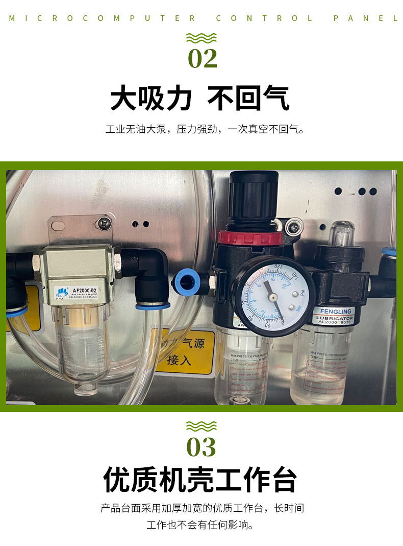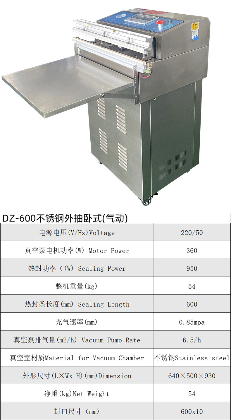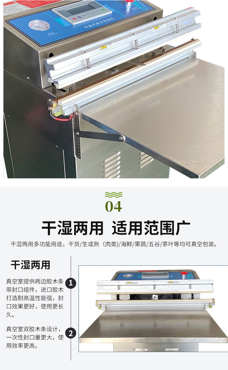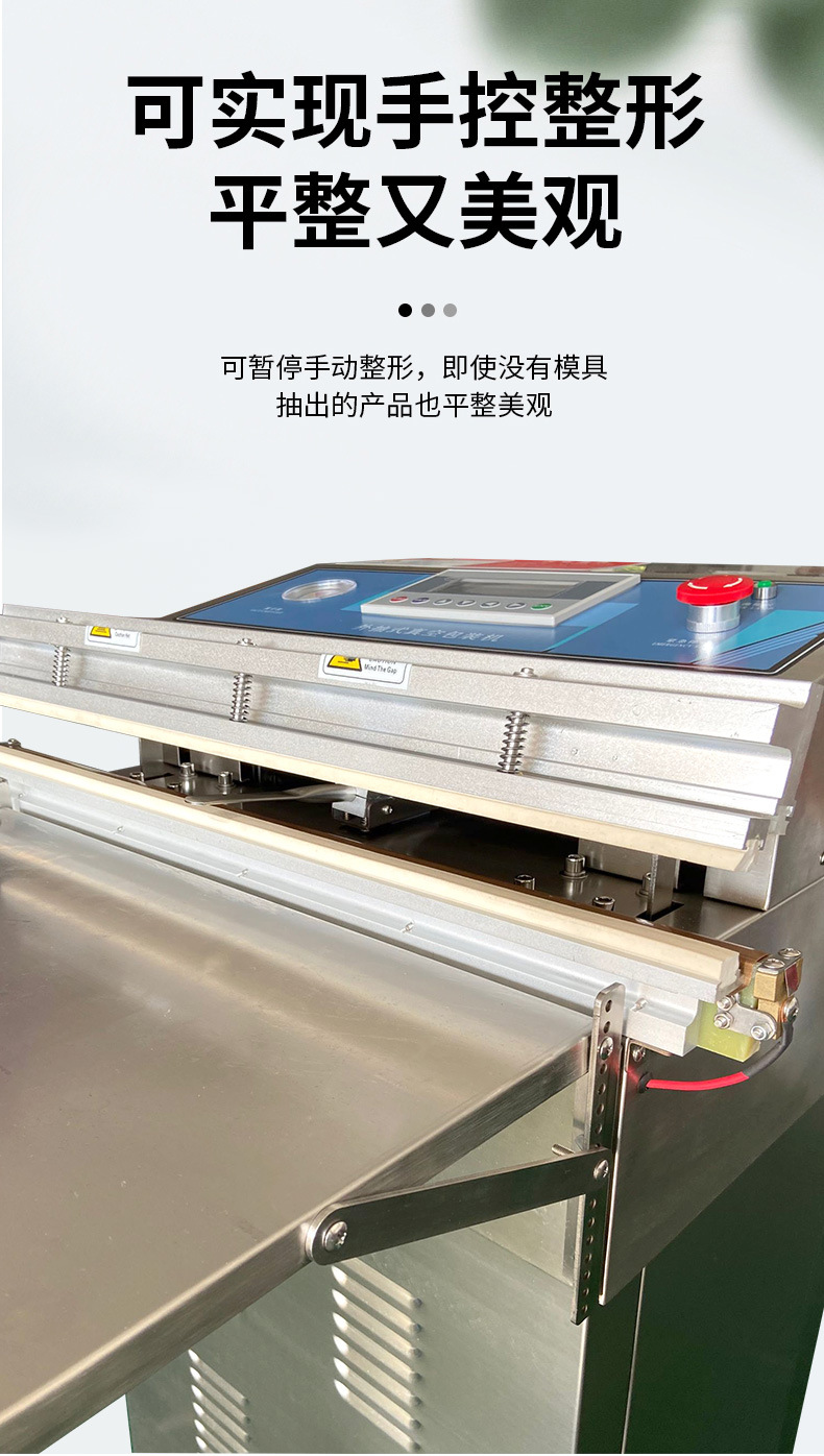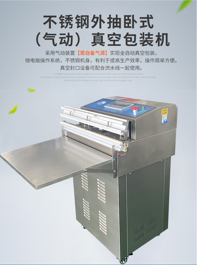 相較于單式內抽真空包裝機,氣動外抽真空包裝機優(yōu)勢顯著。在工作方式上,外抽式無需將產品放入真空室,直接在外部對包裝袋抽氣,可避免產品受真空室尺寸限制,輕松包裝大型或形狀特殊產品。在包裝效率方面,外抽式抽氣速度快,像食品外賣行業(yè),能快速完成餐食包裝,適應快節(jié)奏生產需求,而內抽式因真空室需密封、抽氣、恢復常壓等步驟,流程相對耗時