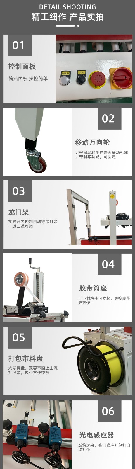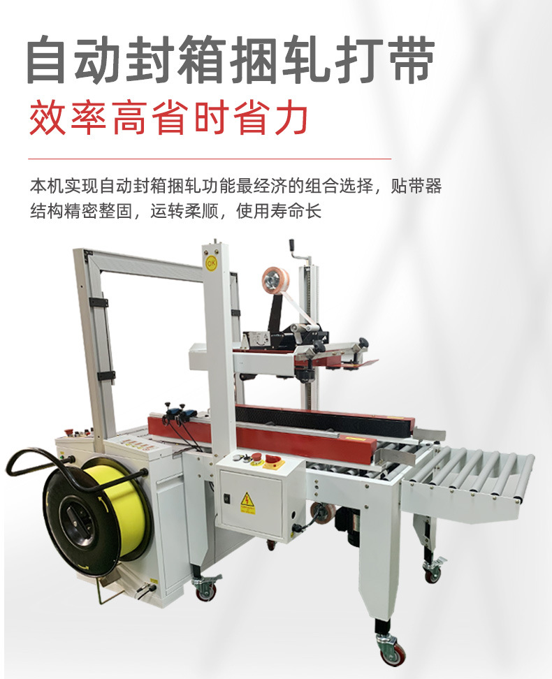 全自動封箱打包一體機,猶如一位不知疲倦且技藝精湛的包裝大師,在現(xiàn)代工業(yè)包裝領域展現(xiàn)出卓越的效能。其自動化連續(xù)作業(yè)模式,徹底革新了傳統(tǒng)包裝流程。設備啟動后,通過精密設計的輸送帶,平穩(wěn)且快速地將待包裝紙箱源源不斷地輸送至封箱工位。在封箱環(huán)節(jié),智能機械臂或高效皮帶裝置精準無誤地將紙箱上蓋與下蓋迅速折合,動作一氣呵成,緊接著膠帶粘貼裝置以極高的速度和精度,將膠帶整齊牢固地貼合在紙箱接縫處,完成完美封箱。封箱后的紙箱無縫銜接,即刻被輸送至打包工位。此時,打包機的穿帶機構如同靈動的舞者,敏捷地將打包帶準確無誤地穿過紙箱預設的打包位置,隨后拉緊機構瞬間發(fā)力,將打包帶緊緊束縛在紙箱上,最后通過熱熔或咬合機構,實現(xiàn)打包帶的穩(wěn)固連接,整個過程流暢自然。