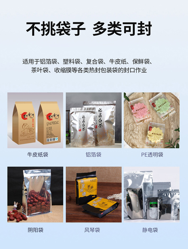 - 包裝材料:不同材質、厚度的包裝材料對封口效率有一定影響。一般來說,材質較薄、熱封性能好的塑料薄膜,如普通 PE 薄膜,封口速度相對較快,因為其所需的加熱時間較短,冷卻速度也快,能較快進入下一次封口流程。而對于厚度較大或材質較特殊的包裝材料,如多層復合薄膜或帶有鋁箔層的薄膜,可能需要更高的溫度和更長的封口時間,會在一定程度上降低封口效率。