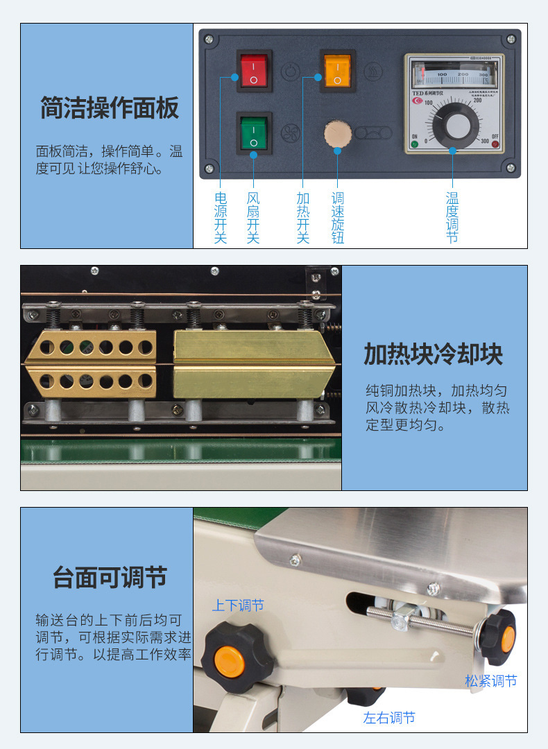 立式連續封口機適用于各種塑料薄膜的封口及制袋,如鋁箔袋、塑料袋、復合袋等