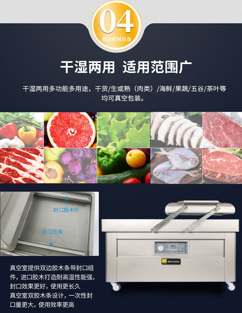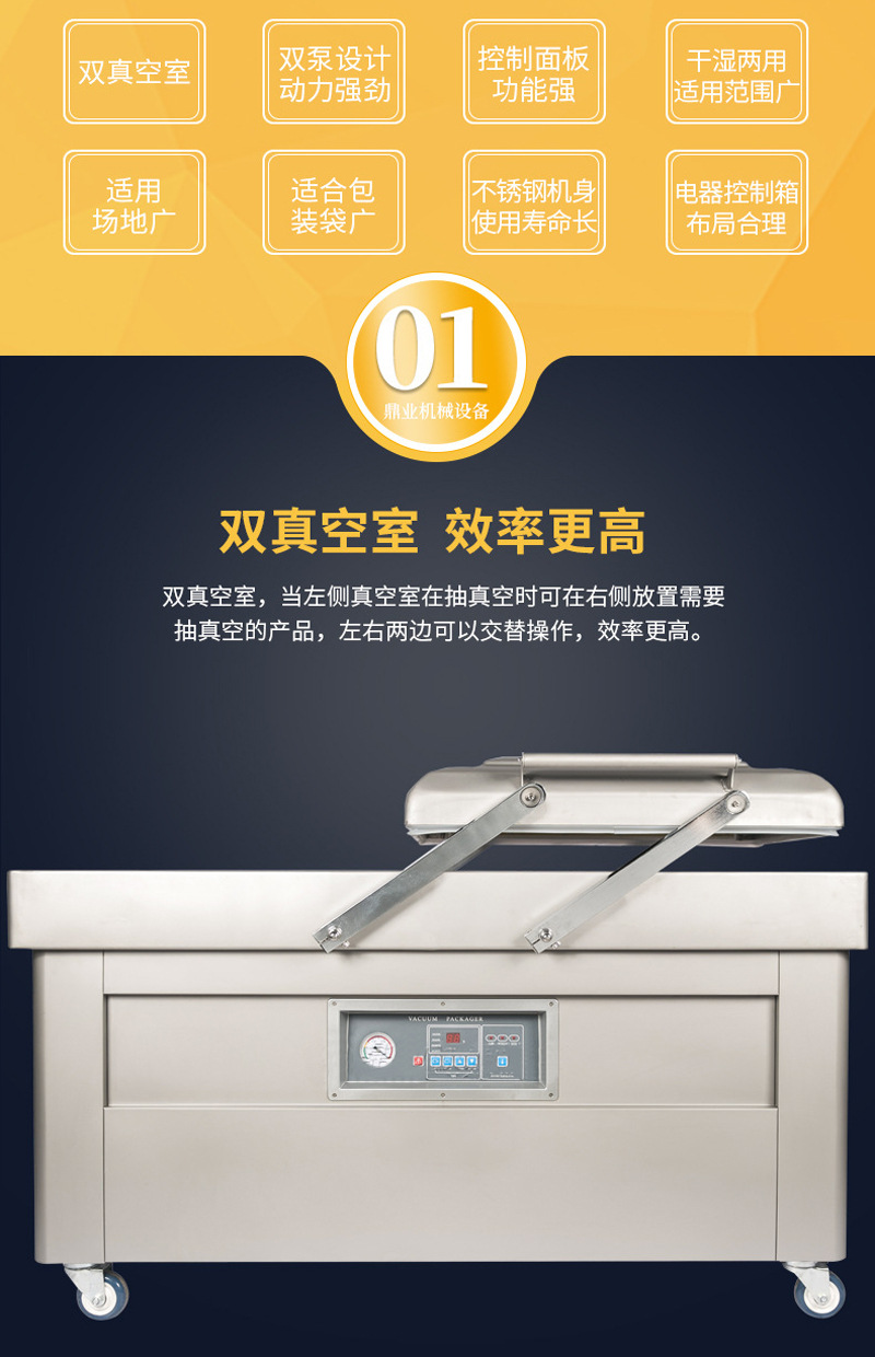 4. 完成包裝:熱封完成后,真空室開始回氣,待真空室內壓力與外界平衡后,打開真空室蓋子,取出包裝好的產品;同時,在另一個真空室內進行下一輪的產品放置和包裝操作,如此循環往復。