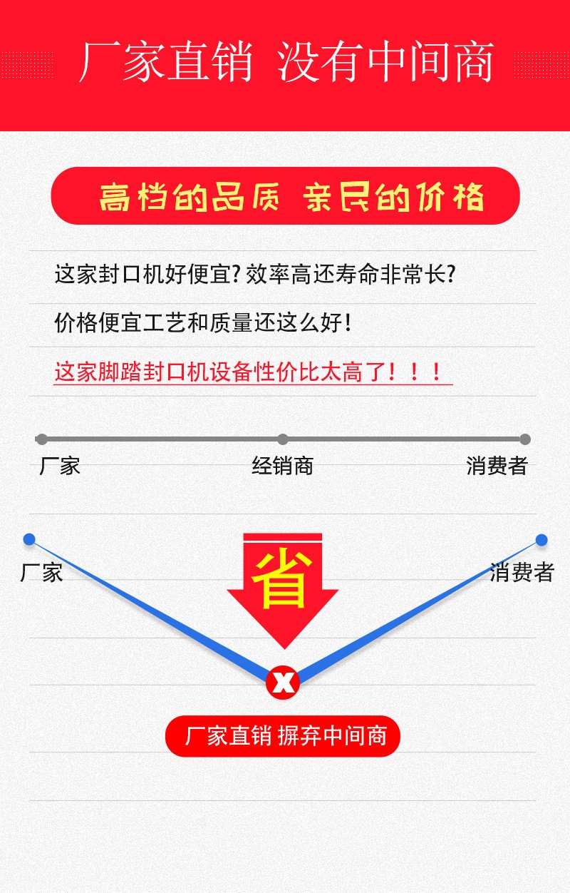 - 設(shè)備成本低:相比一些全自動(dòng)的封口設(shè)備,腳踏封口機(jī)結(jié)構(gòu)相對(duì)簡(jiǎn)單,價(jià)格較為低廉,對(duì)于小型企業(yè)、家庭作坊或預(yù)算有限的用戶來(lái)說(shuō),是一種性?xún)r(jià)比高的選擇。