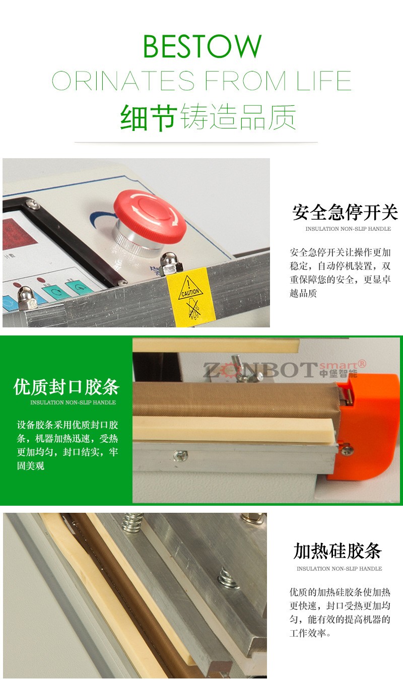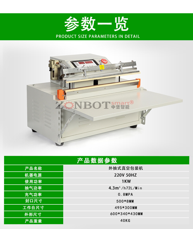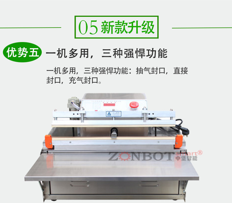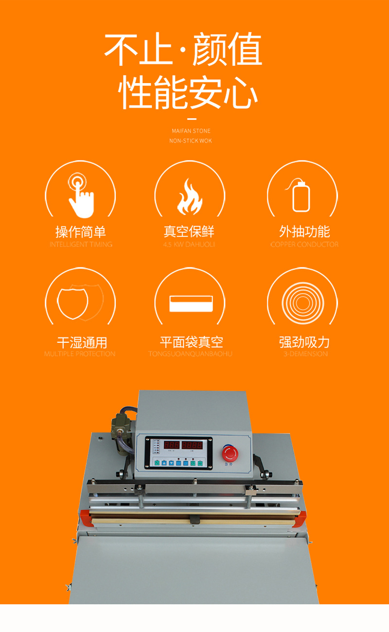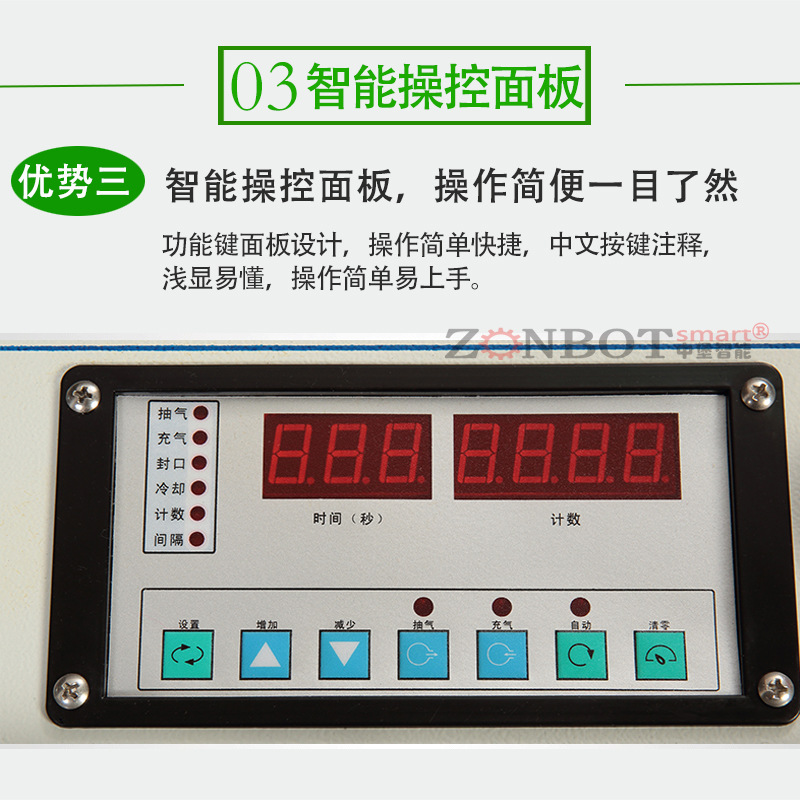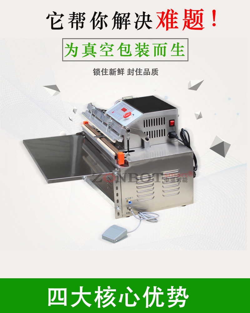 真空包裝機能夠自動抽出包裝袋內的空氣,達到預定真空度后完成封口工序。亦可再充入氮氣或其它混合氣體,然后完成封口工序。真空包裝機常被用于食品行業,因為經過真空包裝以后,食品能夠抗氧化,從而達到長期保存的目的。