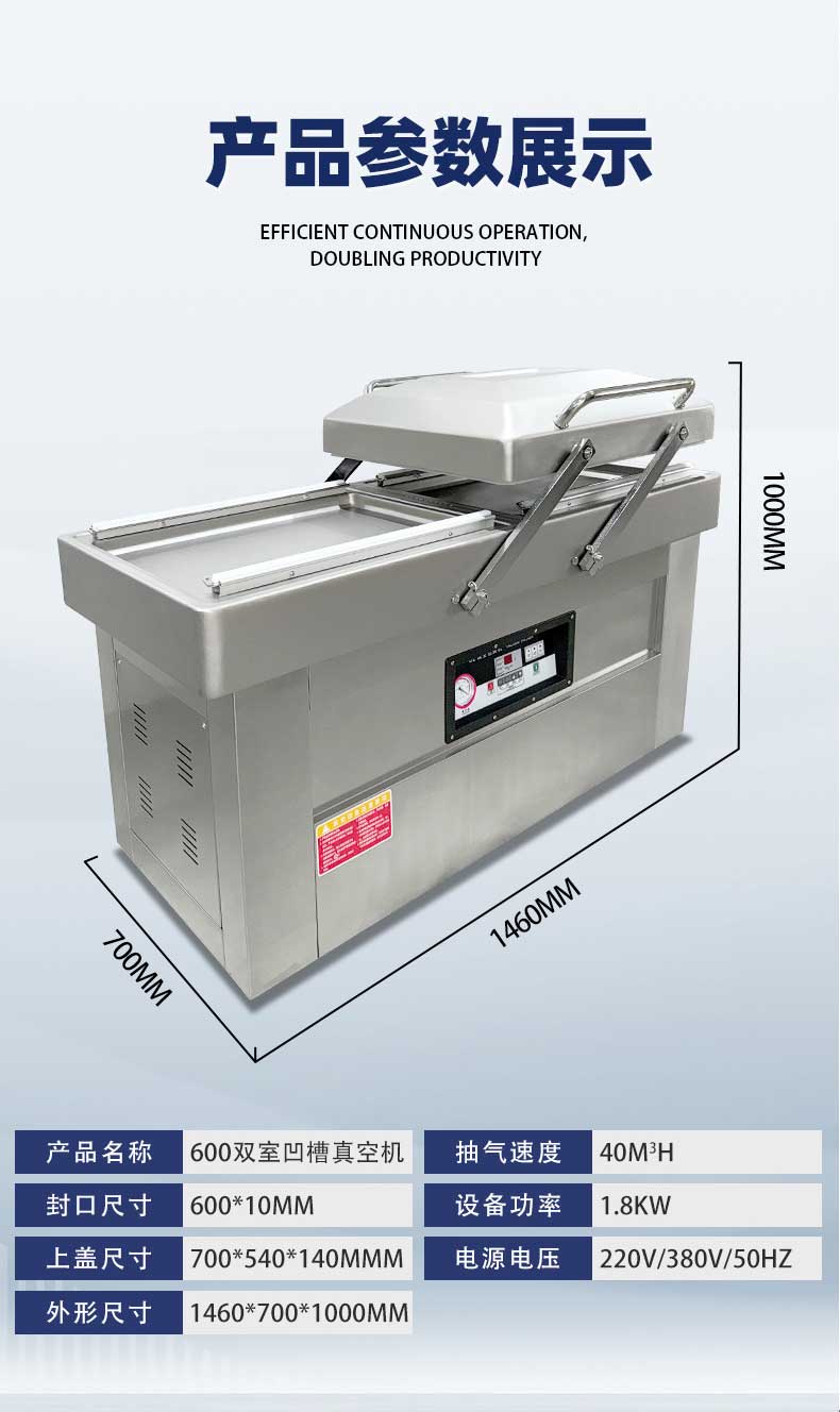 雙室凹槽真空包裝機是一種高效的真空包裝設備,廣泛應用于食品、電子等行業。雙室凹槽真空包裝機通過抽氣泵將袋子內的空氣抽走,形成真空狀態,然后通過熱封機將袋子密封。其主要由真空泵、真空室、熱封機和電控系統組成。具體工作步驟為:將食品放入袋子并置于真空室后,按下啟動按鈕,真空泵抽取袋子內空氣,達到設定真空度后,熱封機進行封口操作,封口完成后設備自動停止。
